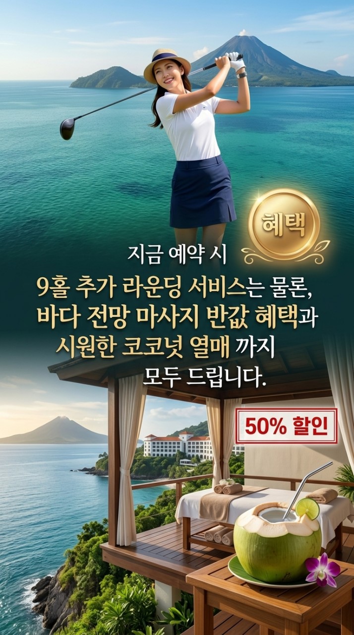 4. 사전예약 시 9홀 추가 서비스는 물론 리조트 바다뷰에서의 스페셜 마사지까지 반값!