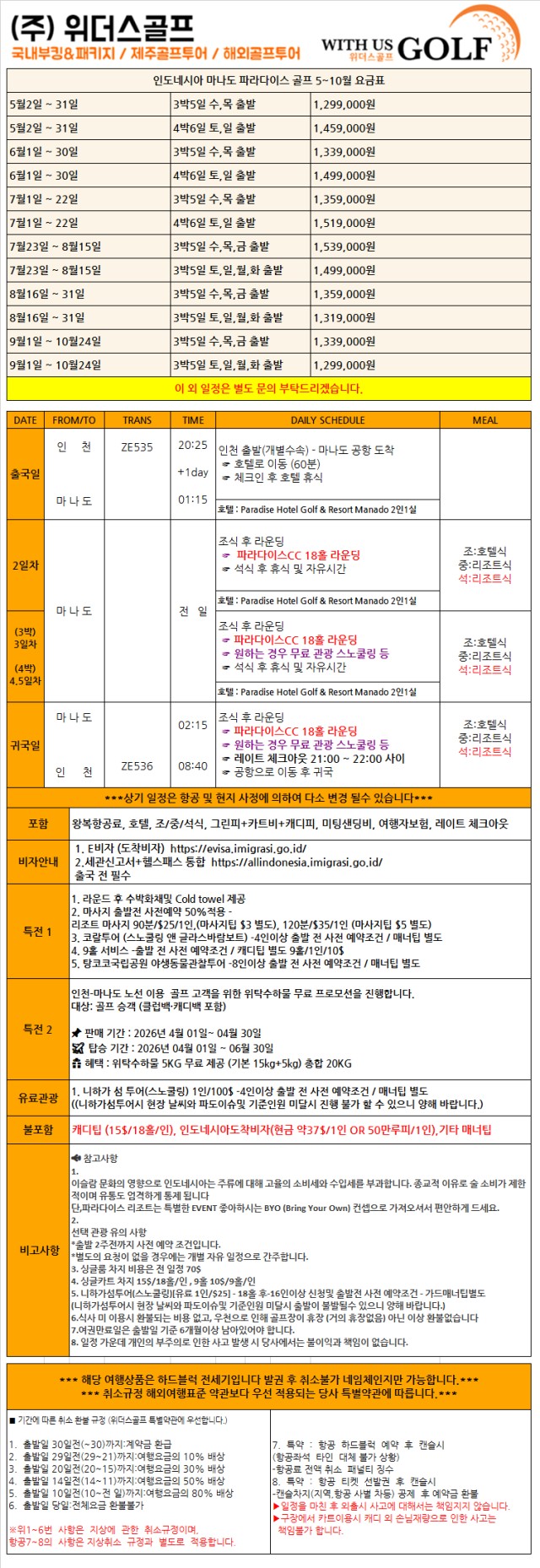 5월2일 ~ 31일3박5일 수,목 출발1,299,000원