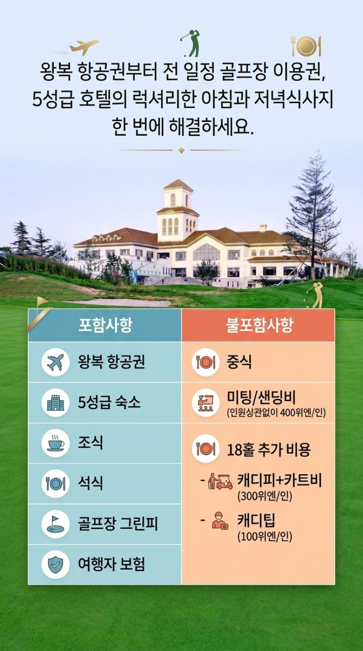 ▶ 현지 9홀추가비용 인당 주중 350위엔 / 주말 400위엔 입니다. (포함:그린피,캐디피,전동카)
